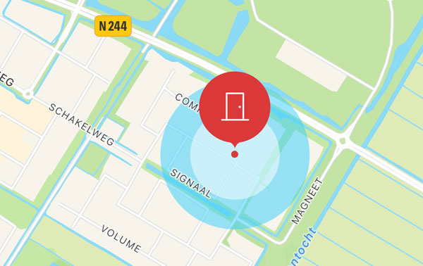 Een zelf in te stellen zone zorgt ervoor dat het slot alleen automatisch opent als u de eerste keer binnen de zone en binnen Bluetooth bereik van het deurslot bent.